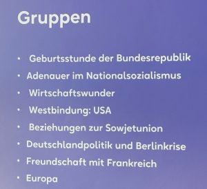 In Form eines Workshops, kombiniert mit einer Führung du rch die Ausstellung, erhielten wir einen Einblick in die deutsche Nachkriegsgeschichte. Der demokratische Neubeginn – vor allem im westlichen Teil Deutschlands – und besonders das Wirken Konrad Adenauers als erster Bundeskanzler der Bundesrepublik Deutschland von 1949 bis 1963 standen dabei im Mittelpunkt. Anhand verschiedener Stationen durchliefen wir historische Zeitabschnitte und die interaktiven Medienstationen und sehr gut aufbereiteten Quellen in Form von Dokumenten und verschiedenen Objekten gaben uns einen Einblick über die demokratische Entwicklung der Bundesrepublik. Dabei stand Konrad Adenauer im Mittelpunkt der Betrachtungen, wie er als Politiker, aber auch als Privatmann akzeptiert und geachtet wurde.