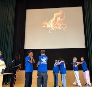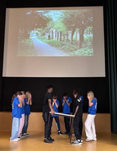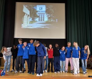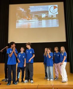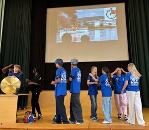 Als kulturelle Umrahmung der Sportlerehrung an unserer Schule führten die Schülerinnen und Schüler der Klasse 8b ein eigen kreiertes Theaterstück auf. Sie bearbeiteten die Ballade „John Maynard“ von Theodor Fontane und zeigten dem Publikum auf der Bühne die dramatische Rettungsaktion des Steuermannes, der es schaffte, das brennende Schiff und die Passagiere zu retten. Zur Freude der Zuschauer gab es eine neues Ende:
